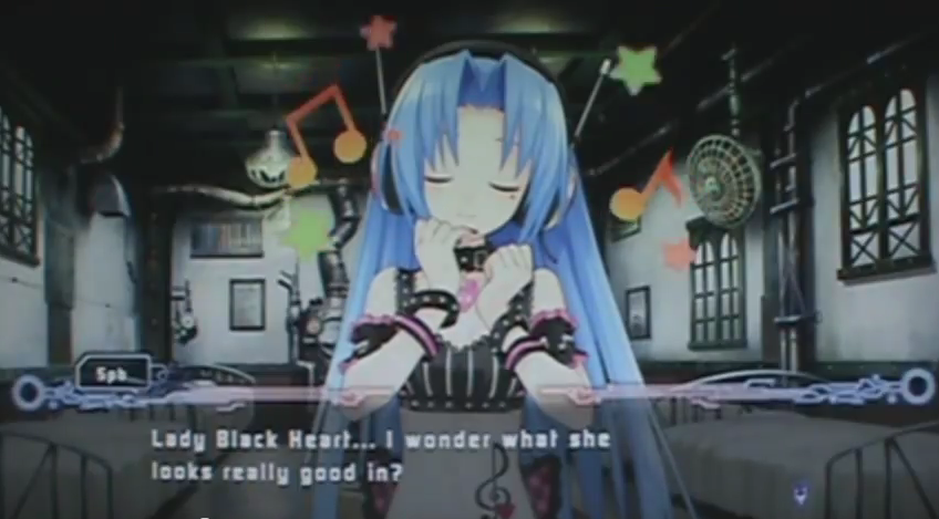 - In one optional scene in the game, 5pb. vaguely references Hatsune Miku when imagining what kind of cosplay Black Heart would look good in. Her appearance is also rather similar to a Vocaloid.