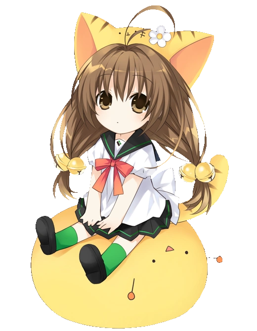 Broccoli is a fair skinned little girl, appearing to be younger than or about the age of Gust. She has dull yellow-brown eyes and is a light brunette. Her hair is almost the size of her body and worn in two pigtails with two bells holding each one. Her long bangs frame her face and she has two un-even cowlicks. On her head she wears a yellow cat eared hat on her head with a tiny kitty face, single stitch, a daisy, and few brown stripes on each ear.