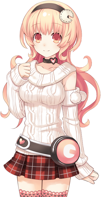 She wears a tan-white wool styled tank top with big neck and un-attached sleeves and matching styled boots, but with small ribbons/fuzzy balls at the top. Compa also wears a red plaid skirt, a black choker with a small heart on it, black-brown kneesocks with light pink heart cut frills, and often carries a black hip purse, and heart shaped buttons. Like her headband, both her purse and the heart on the choker has a C logo.