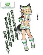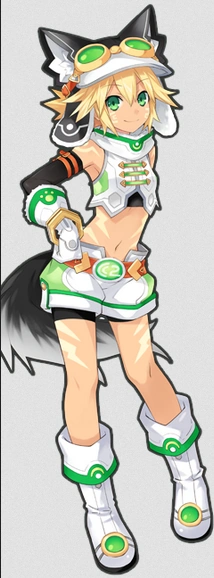 CyberConnect2 is a tan skinned girl with brilliant emerald eyes and blonde, spiked hair worn with a white and black themed hat, gold goggles with green lenses, and pointed canine ears. She has white body markings and a black and white tail. She also has a fair sized bust.