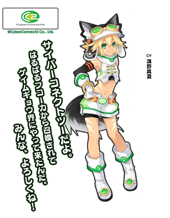 CyberConnect 2 (サイバーコネクトツー Saibākonekutotsū) is a character introduced in Hyperdimension Neptunia Victory. She is a DLC character which must be downloaded to use.