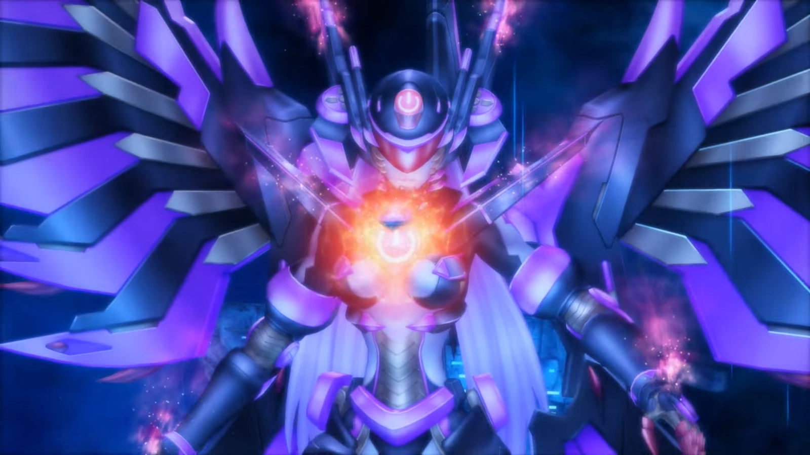Dark Purple is as tall as a skyscraper, standing a humongous 30-meters (98 feet) tall. She is possesses normal Dark CPU equipment, but with a pinkish color scheme. Her wings are gigantic and are as large as her, which gives her the look of a robotic dark angel.
