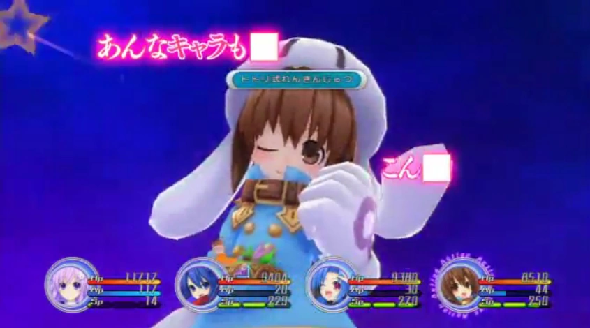 Gust's Drawing Song: The attack begins as Gust stands by herself and draws in the air while dancing and singing. After forming a creature she points, causing many smaller monsters to fall and explode on the target. She finishes by forming a big one that falls down and explodes. The Hyperdimension Neptunia mk2 version of the attack lacks the finisher.