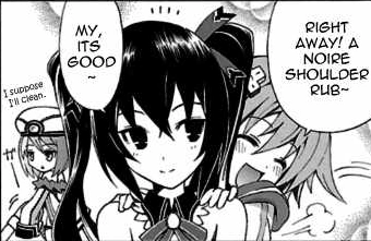 However, Noire informs her that despite all the good fortune and erotic events they may come by, she doesn't have enough money to spare for them to feed and stay for free. Blanc calls her stingy for this. Suddenly Vert pops up and offers all of the girls tea, explaining that as a Goddess too, they must all work for their rent, causing Neptune to suddenly exclaim "Gonna do my best to suck up!", to which Noire told her that's something she shouldn't say out loud... As Blanc begins to clean up, Neptune resorts to rubbing Noire's stiff shoulders, claiming she feels very tense.