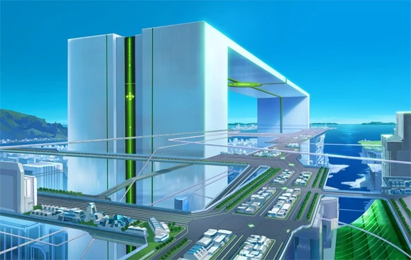 In Hyperdimension Neptunia mk2, Leanbox went through a huge change over the course of many years becoming more simplistic in terms and futuristic. Instead of being a nation full of nature, Leanbox had been urbanized, filled with corporate buildings, warehouses, skyscrapers, and typical urban structures. A noticable towering structure can be seen all over Leanbox. It takes a form of a collosal white structure with black streaks filled with green light in the middle of its perpendicular sides, which ends on a green circle in between.